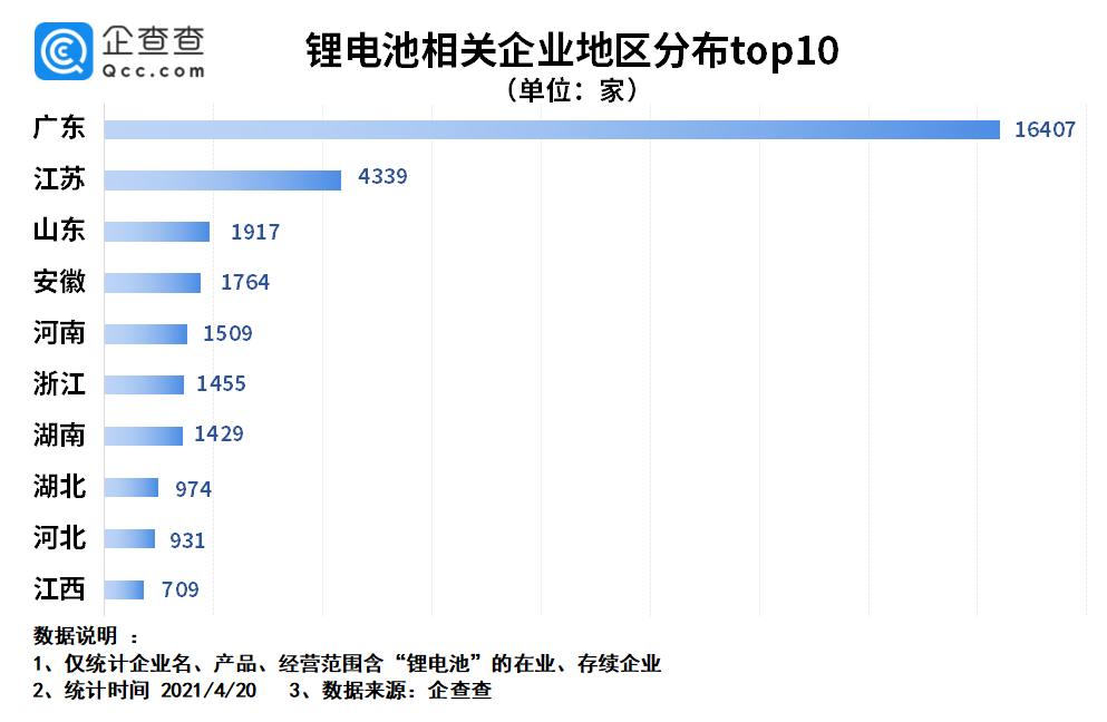 4月19日,鋰電池板塊持續走強,拓邦股份、中礦資源、天際股份、多氟多等多股漲停,豪森股份、億緯鋰能、長信科技等漲逾11%。企查查數據顯示,目前我國共有3.76萬家鋰電池相關企業,廣東省以1.64萬家企業高居第一,江蘇、山東分列二三名。2020年,鋰電池相關企業注冊量為5821家,同比下降25.2%,今年一季度新注冊1028家,同比下降3.11%。此外,全行業40%的企業注冊資本高于500萬。