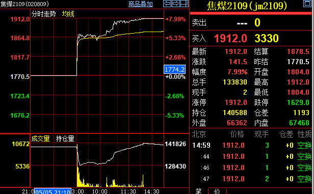 “漲停了,漲停了”。5月6日,勞動節后上班第一天,動力煤和焦煤市場交易一片火爆景象。在動力煤期貨市場上,各期限合約紛紛上漲,主力合約價格達到了849.8元/噸,尾盤漲幅突破8%,刷新歷史高點。