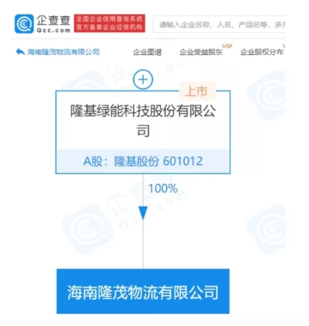 企查查APP顯示,5月6日,海南隆茂物流有限公司成立法定代表人為鐘寶申,注冊資本1000萬元人民幣,經營范圍包含:國內貨物運輸代理;國際貨物運輸代理;陸路國際貨物運輸代理;裝卸搬運;普通貨物倉儲服務等企查查股權穿透顯示該公司由隆基股份(601012)100%控股。