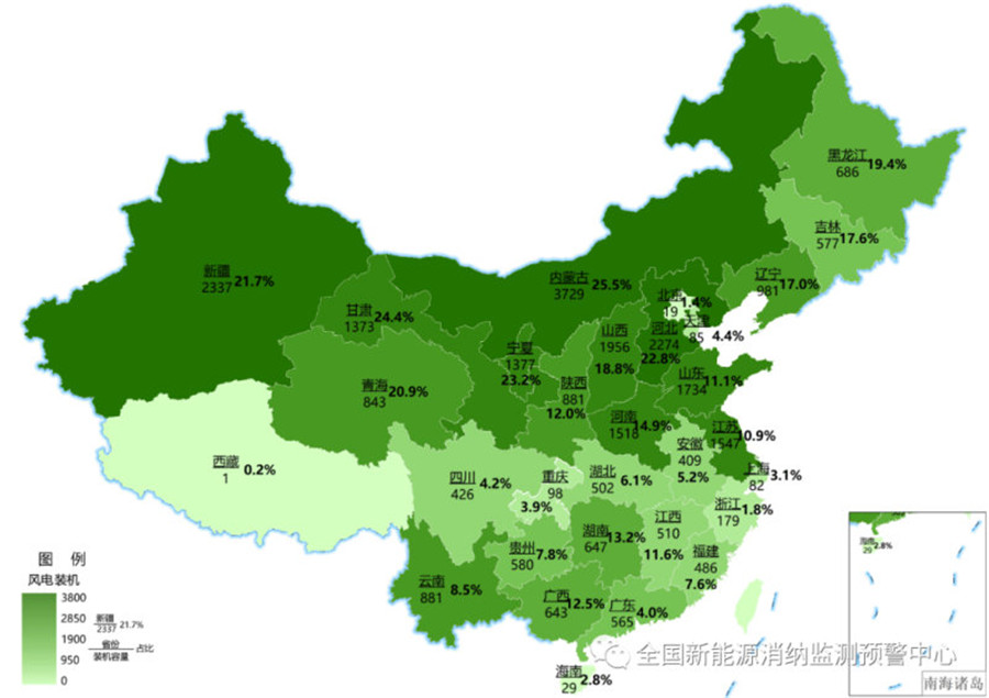 圖一、截至2020年底各地區累計風電裝機(萬千瓦)及占本地區總裝機比重