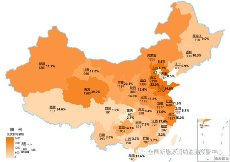 圖二、截至2020年底各地區累計光伏發電裝機(萬千瓦)及占本地區總裝機比重