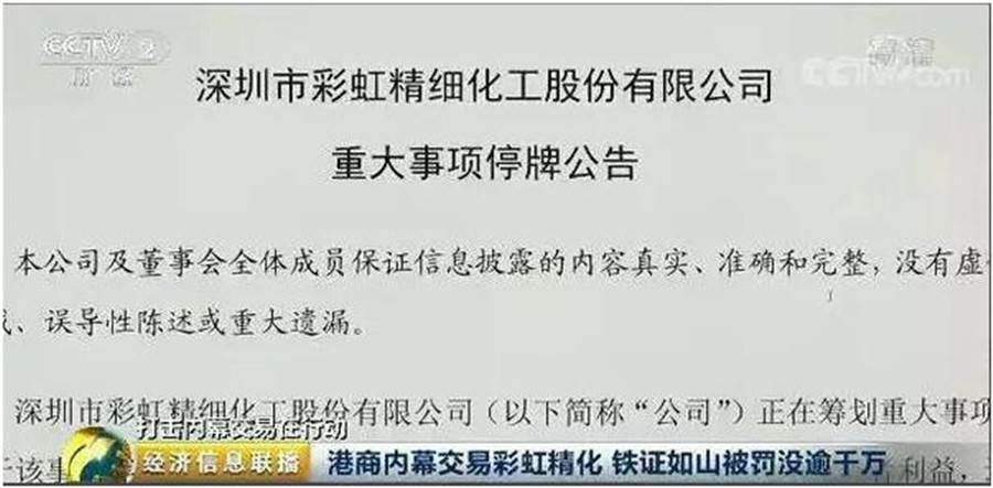 2017年4月,中國證監(jiān)會(huì)行政處罰委下達(dá)行政處罰決定書,認(rèn)定當(dāng)事人余偉業(yè)內(nèi)幕交易彩虹精化股票,沒收違法所得250余萬元,并對(duì)他處以750余萬元的罰款。