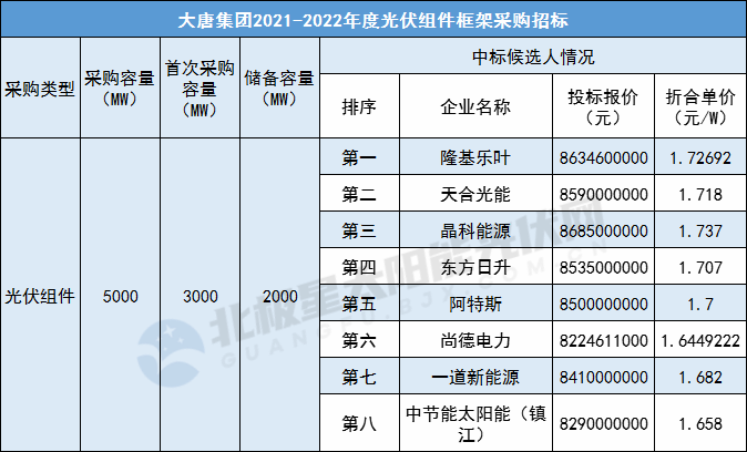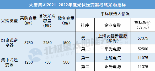 5月14日,大唐集團公布2021-2022年度5GW光伏組件、5GW光伏逆變器集采中標候選人。