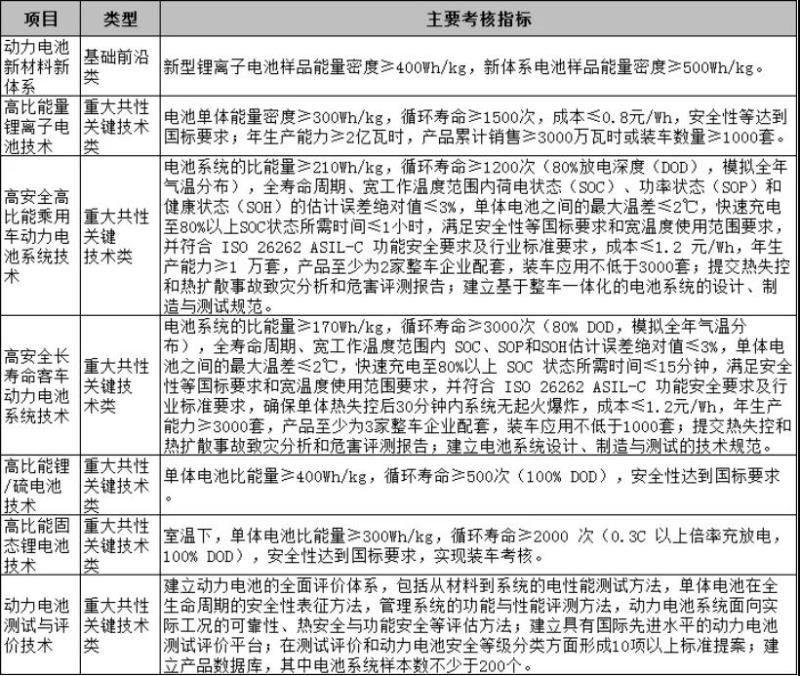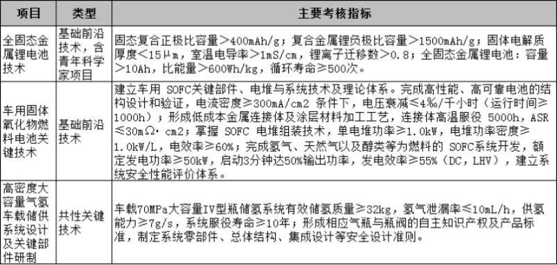 其中,在能源動(dòng)力方面,將重點(diǎn)圍繞全固態(tài)金屬鋰電池技術(shù)、車用固體氧化物燃料電池關(guān)鍵技術(shù)、高密度大容量氣氫車載儲(chǔ)供系統(tǒng)設(shè)計(jì)及關(guān)鍵部件研制作出支持。主要考核指標(biāo)如下:
