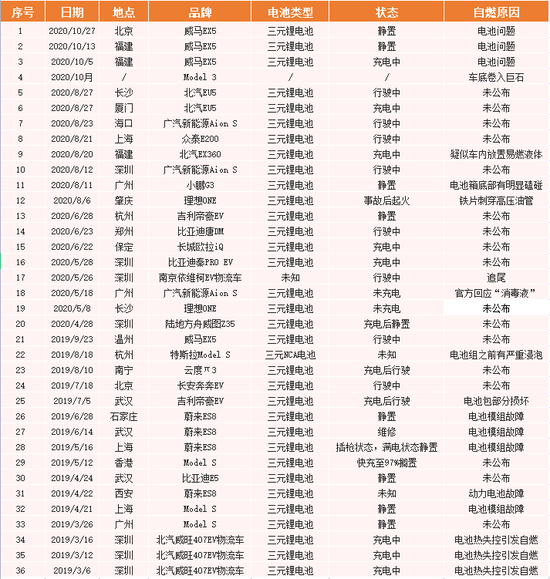據盒飯財經不完全統計,從2019年3月到去年12月,國內電動車發生自燃事故共有36起,其中有33起事故車輛,搭載的電池類型均為三元鋰電池,而關于自燃原因,據已公布消息顯示,其中14起均與電池相關。