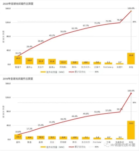 目前,頭部企業(yè)的行業(yè)集中度已經(jīng)比較高,而且還在不斷提高。截至2020年底,多晶硅環(huán)節(jié)前5名占比87.5%,硅片環(huán)節(jié)前5名占比88.1%,電池環(huán)節(jié)前5名占比53.2%。原本相對分散的組件環(huán)節(jié),前5名的占有率已經(jīng)從2019年的38.3%提升到了2020年的56.6%。
