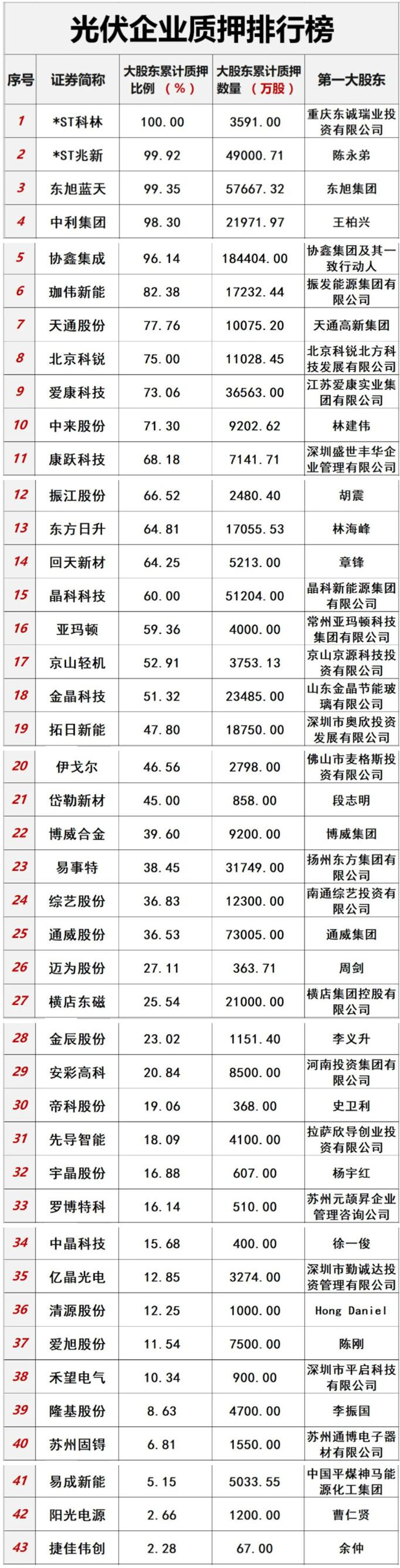 *ST科林、質(zhì)押比例達(dá)100%;*ST兆新、質(zhì)押比例99.92%;東旭藍(lán)天、質(zhì)押比例99.35%;中利集團、質(zhì)押比例98.30%;協(xié)鑫集成、質(zhì)押比例96.14%。
