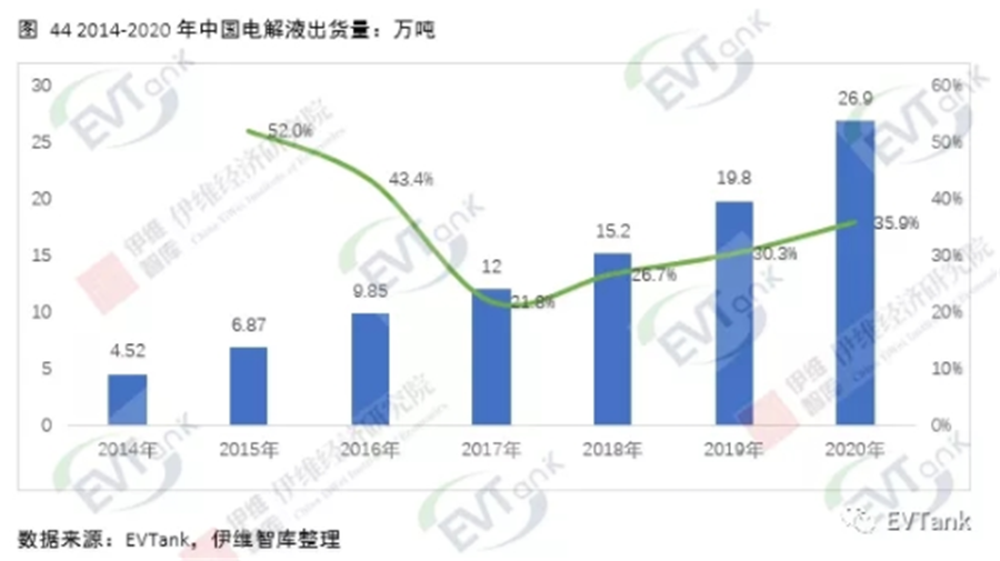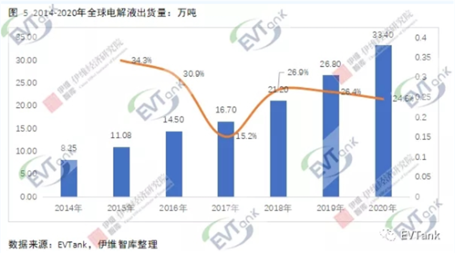 近日,研究機(jī)構(gòu)EVTank聯(lián)合伊維經(jīng)濟(jì)研究院共同發(fā)布了《中國(guó)鋰離子電池電解液行業(yè)發(fā)展白皮書(shū)(2021年)》,白皮書(shū)數(shù)據(jù)顯示,2020年全球鋰離子電池電解液出貨量達(dá)到33.4萬(wàn)噸,同比增長(zhǎng)24.6%,整體市場(chǎng)規(guī)模達(dá)到152.7億元。EVTank分析認(rèn)為,2020年全球鋰離子電池電解液出貨量的增長(zhǎng)主要來(lái)自于中國(guó)企業(yè)。