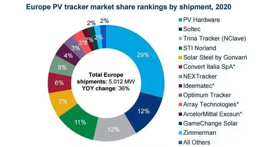 2020年歐洲地區(qū)的出貨量占全球的11%,達到了5GW。與2019年相比,市場更加分散和多元化。PV Hardware以29%的市場份額占據(jù)了頭部位置。Soltec和Trina Tracker則以微小的差距分別排在了第二和第三。