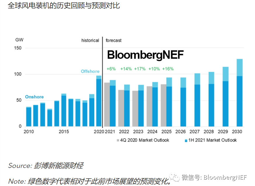 在經(jīng)歷了破紀錄的2020年之后,全球風電裝機熱潮將在今年有所冷卻。在中國的強力拉升下,全球風電建設在2020年發(fā)展迅猛,但將在2021年有所回落。彭博新能源財經(jīng)預計,歐洲、中東和非洲(EMEA)、拉丁美洲及其他亞太市場的陸上風電建設將達到有史以來最高水平。美國陸上風電建設規(guī)模也將與去年的紀錄持平。2025年后,隨著除中國以外所有地區(qū)的陸上風電建設均步入平臺期,全球風電增長將主要靠海上風電拉動。