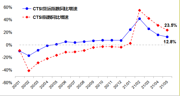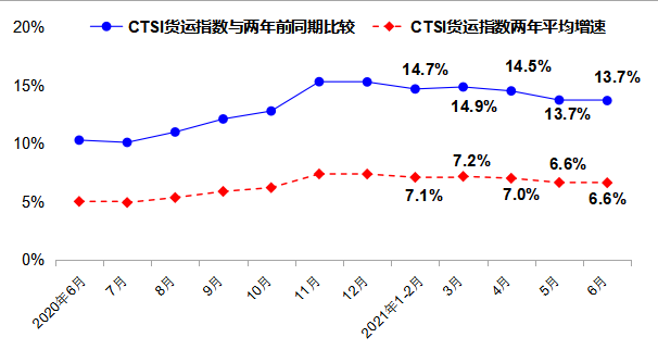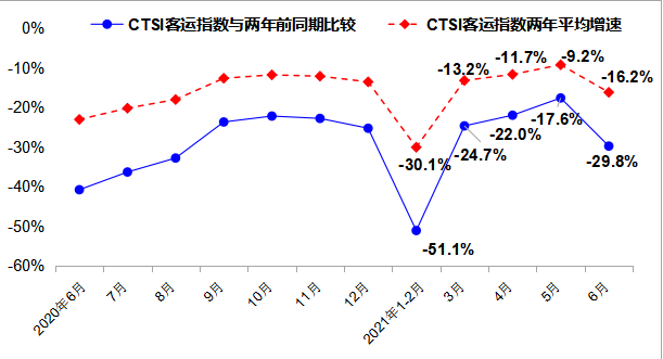 2021年6月,CTSI指數為171.9點,同比增長11.7%,比2019年同期下降1.2%。分結構看,CTSI貨運指數為200.5點,同比增長8.2%,比2019年同期增長13.7%,兩年增幅與5月持平;CTSI客運指數為119.2點,同比增長23.4%,比2019年同期下降29.8%,兩年降幅較5月出現擴大。