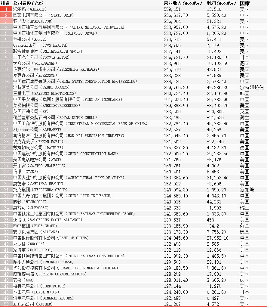 8月2日,《財富》世界500強排行榜發布。受新冠疫情影響,今年《財富》世界500強排行榜企業的營業收入約為31.7萬億美元,比去年下降5%。今年,沃爾瑪連續第八年成為全球最大公司,中國的國家電網公司上升至第二位,亞馬遜首次進入前三,蘋果公司前進至第6位。