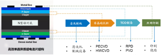 HJT電池工藝環節相對簡單,主要包括清洗制絨、非晶硅沉積、TCO膜制備、絲網印刷,其中非晶硅薄膜的形成溫度較低(200度),所以一般采用PECVD來制備。