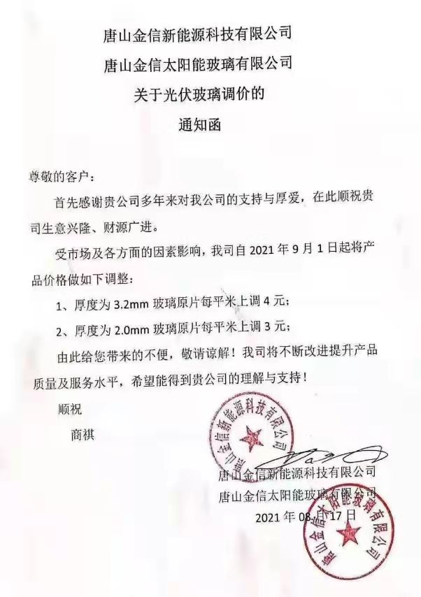 受市場影響,光伏玻璃也開始調(diào)價。唐山金信太陽能玻璃有限公司發(fā)布關(guān)于光伏玻璃調(diào)價的通知:受市場及各方面的因素影響,我司自2021年9月1日起價格調(diào)整:厚度3.2mm玻璃原片每平米上調(diào)4元,厚度2.0mm玻璃原片每平米上調(diào)3元。此外,福建臺玻及拓日新能源公告,將3.2mm鍍膜產(chǎn)品價格上調(diào)0.5-1元/平米至23元/平方米。