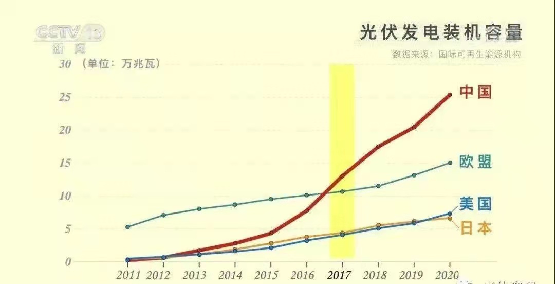 2011年,中國的裝機容量僅為日本、美國的六成,為歐盟的6%。從2013年起,國家加大節能減排力度,光伏產業快速發展。到2017年,中國的裝機容量就超過了整個歐盟的總和。