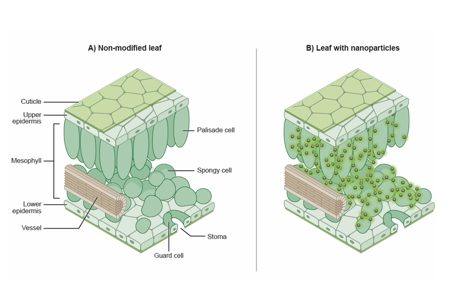 這些粒子直徑有幾百納米,可以通過位于葉片表面的氣孔(小孔)注入植物體內。這些粒子聚集在“葉肉”的海綿層內,形成一層薄膜。研究人員說,這項新研究的主要結論是,活體植物的葉肉,可以顯示這些光激粒子,又不損害植物或犧牲燈光的屬性。