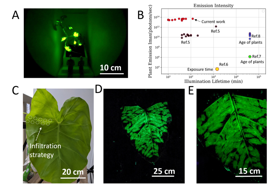 研究人員展示,他們可以照射一種植物稱為泰國象耳的的葉子(超過一英尺寬)用作戶外“光源”。