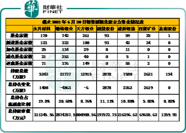 截止2021年6月30日,持倉(cāng)永興材料的基金公司總共有170家,排名第三,持股綜數(shù)5000多萬(wàn)股,總持倉(cāng)占流通盤(pán)比例為19.8%,從基金總數(shù)與持股總數(shù)來(lái)看,永興材料在主力資金青睞度方面,僅次于贛鋒鋰業(yè)與天齊鋰業(yè),具體如下表所示: