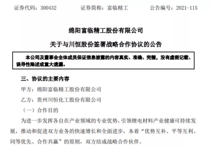 1、富臨精工與川恒股份在磷酸鐵鋰正極材料領域達成合作