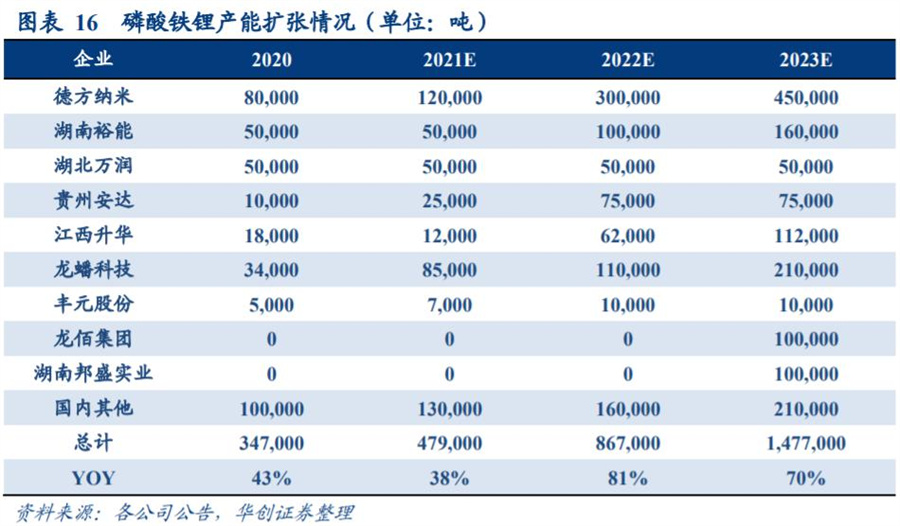 景氣高企甚至帶動了中核鈦白、龍蟒佰利等化工行業龍頭集中跨界,試圖憑借自身磷礦資源優勢占據高點,但華創證券上述報告認為,大部分企業是從前驅體磷酸鐵切入,對于磷酸鐵鋰布局信息較少,短期內對行業邊際產能貢獻有限。