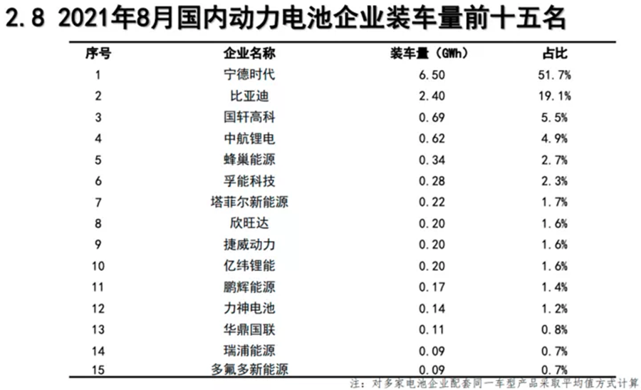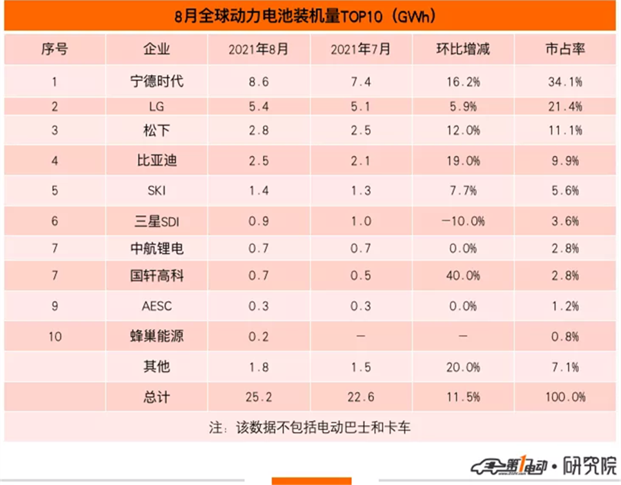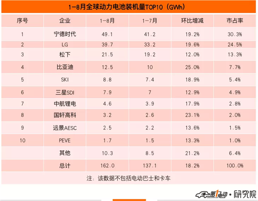 8月,寧德時(shí)代繼續(xù)高歌猛進(jìn),穩(wěn)坐冠軍寶座,LG、松下分列季軍和亞軍。正在慢慢逼近松下的比亞迪和SKI分列前五;三星SDI、中航鋰電、國(guó)軒高科、遠(yuǎn)景AESC、蜂巢能源分列前十。