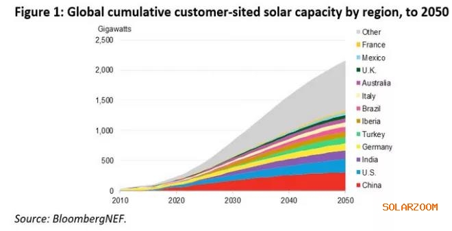 圖:世界各地區2050年前用戶側光伏裝機增長趨勢(彭博新能源財經)