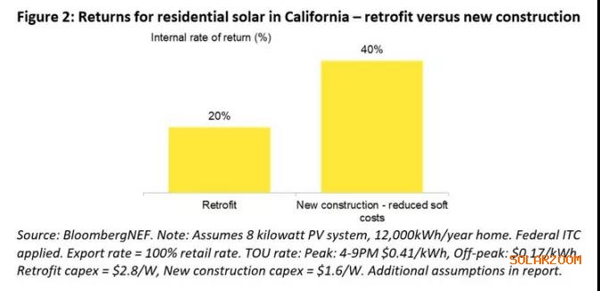 圖:美國加州已有住宅和新建住宅安裝戶用光伏的投資收益比較(彭博新能源財經)