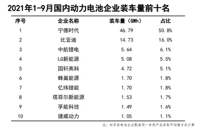 中國汽車動力電池產業(yè)創(chuàng)新聯(lián)盟數據顯示,今年1-9月,國內動力電池企業(yè)裝車量前5名分別為:寧德時代(占比50.8%)、比亞迪(占比16.0%)、中航鋰電(占比6.1%)、LG新能源(占比5.5%)、國軒高科(占比5.1%)。