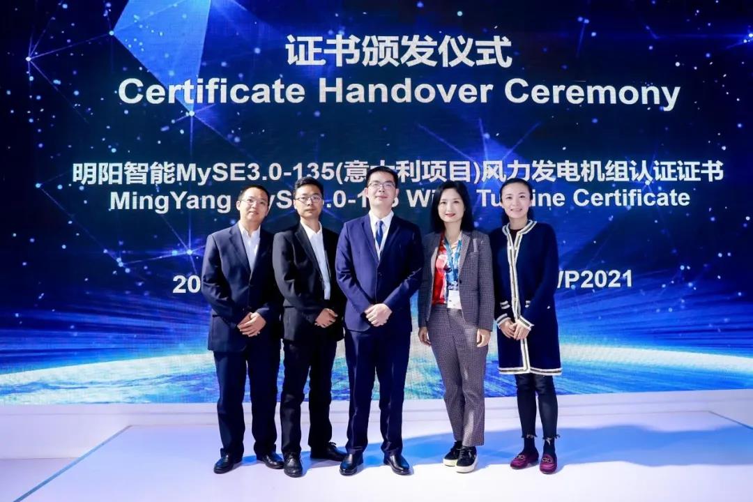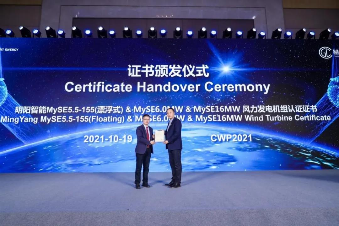 北京鑒衡認證中心向明陽智能頒發了MySE6.0兆瓦機型、MySE16機型和MySE5.5-155漂浮式機型頒發機組認證證書。