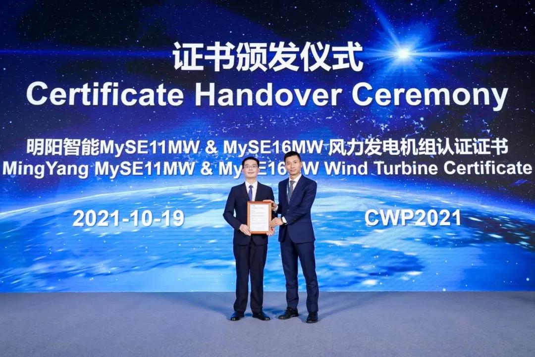 國際認證機構DNV向明陽智能頒發了MySE11和MySE16機型頒發機組認證證書。
