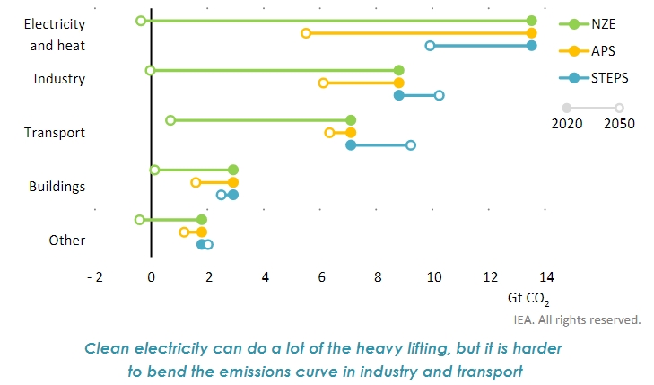 IEA的報(bào)告要表述的意向非常清晰:實(shí)現(xiàn)“2050年凈零排放方案”有很大的困難,但綜合、整體利益巨大;在技術(shù)方面,即使眼前有最具競(jìng)爭(zhēng)力的發(fā)電技術(shù),也要堅(jiān)決限制落后產(chǎn)能的高耗能項(xiàng)目。