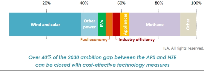 2030年已宣布的承諾方案中和凈零排放情景之間超過40%的目標(biāo)差距可以通過具有成本效益的技術(shù)措施來彌補(bǔ)