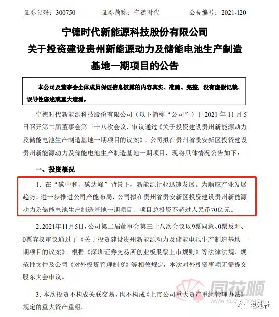 寧德時代發(fā)布公告顯示,擬在貴州省貴安新區(qū)投資建設貴州新能源動力及儲能電池生產(chǎn)制造基地一期項目,項目總投資不超過70億元。