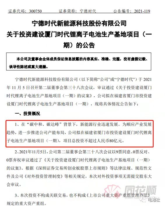 此外,寧德時代再發(fā)公告顯示,擬在福建省廈門市投資建設廈門時代鋰離子電池生產(chǎn)基地項目(一期),項目投資總額不超過80億元,資金來源為企業(yè)自有或自籌資金。