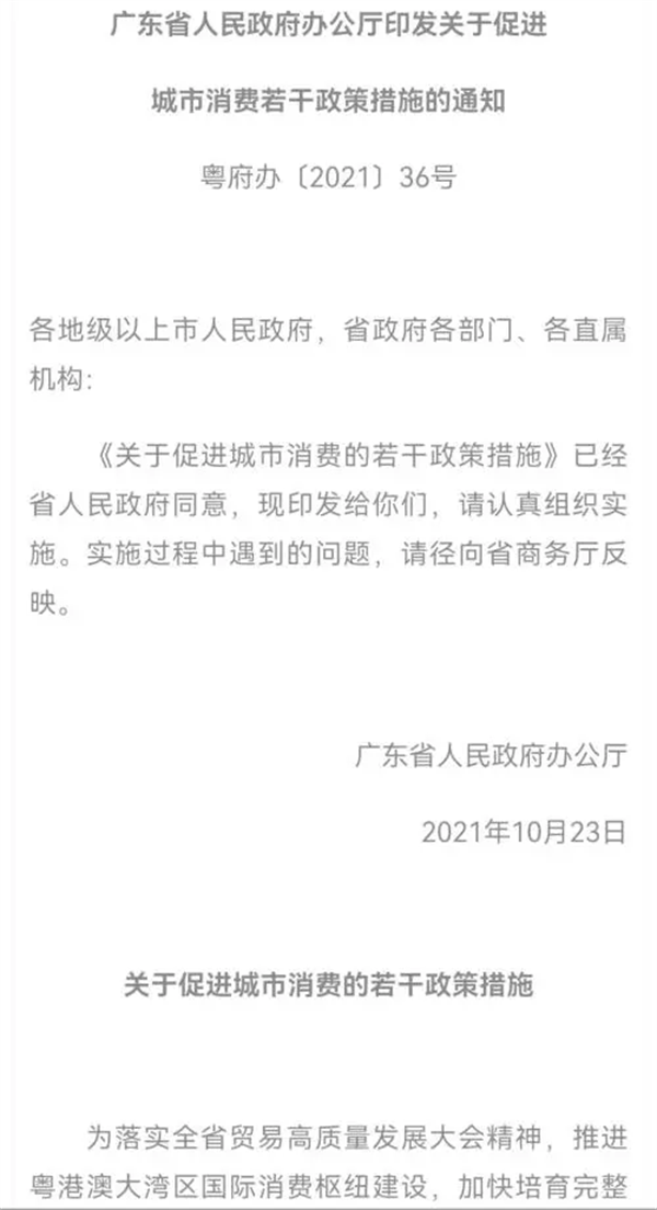 日前,廣東省人民政府官網(wǎng)發(fā)布《廣東省人民政府辦公廳印發(fā)關(guān)于促進(jìn)城市消費(fèi)若干政策措施的通知》(以下簡(jiǎn)稱《通知》)。