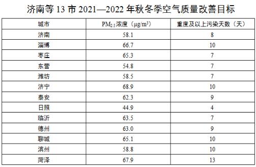 秋冬季期間(2021年10月1日至2022年3月31日),濟南等13市細顆粒物(PM2.5)濃度控制目標和重度及以上污染天數控制目標見下表,青島、煙臺、威海3市達到相應年度空氣質量改善目標。