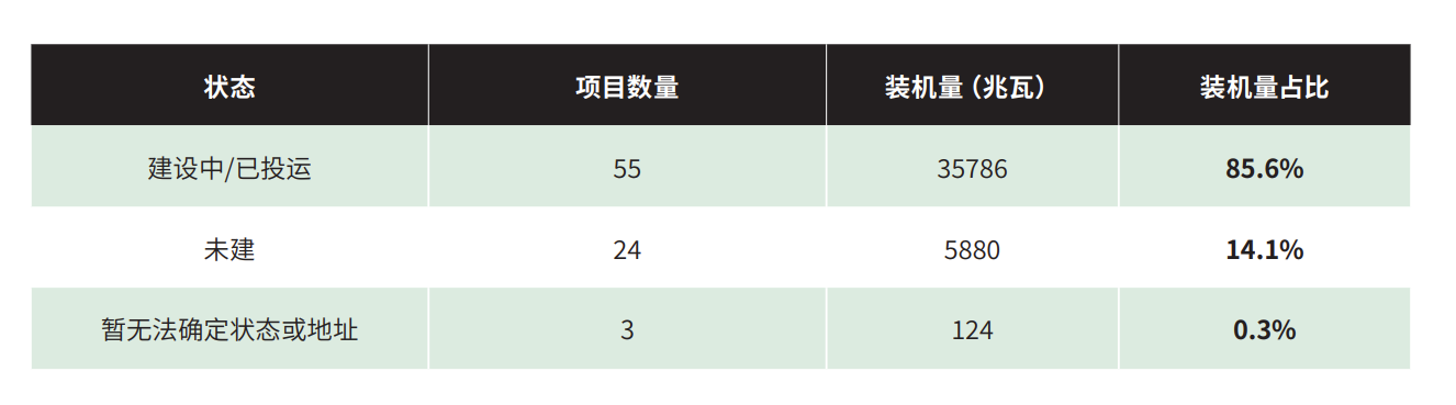 2020年通過各省發改委核準的煤電項目共計82個,總裝機容量為41790兆瓦。截至2021年11月底,55個項目處于建設中/已投運狀態,裝機容量為35786兆瓦,占2020年核準煤電項目總裝機容量的85.6%;未建項目24個,裝機量為5880兆瓦,占比為14.1%。另有124兆瓦的項目由于缺少相關信息,暫時無法確定開工狀態。