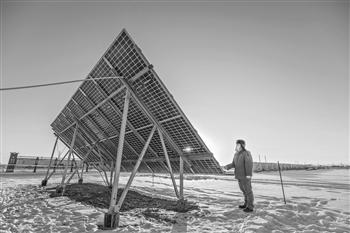 2021年12月25日,新疆油田公司吉慶油田作業區員工在光伏電站巡檢。當日,中國石油新疆油田分公司吉慶油田作業區吉7井區5號平臺8KW微型光伏電站投入運行,并網發電,這標志著新疆油田公司吉木薩爾頁巖油首個綠電采油建設項目開始發電采油。張昀 攝/人民圖片