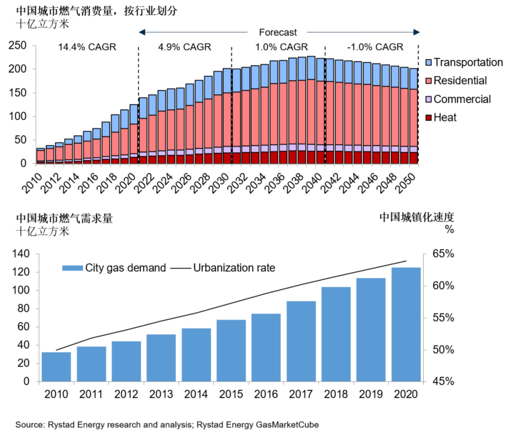 在過(guò)去十年里,中國(guó)的城市燃?xì)庑枨髱缀踉鲩L(zhǎng)了三倍,在2020年達(dá)到1250億立方米,這得益于中國(guó)城鎮(zhèn)化速度加快,城鎮(zhèn)人口比重從20年前的不到40%提升至目前的64%。