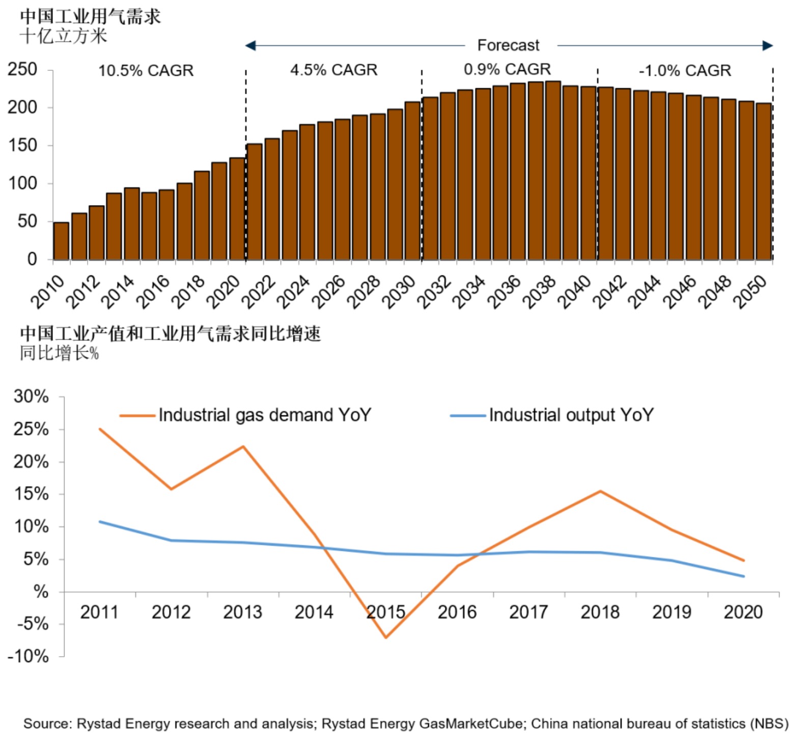 在過(guò)去十年里,中國(guó)工業(yè)用氣幾乎增長(zhǎng)了兩倍,2020年達(dá)到1340億立方米。由于國(guó)內(nèi)經(jīng)濟(jì)強(qiáng)勁增長(zhǎng)和工業(yè)化穩(wěn)步推進(jìn),工業(yè)用氣成為中國(guó)天然氣需求的最大貢獻(xiàn)者,占比41%。
