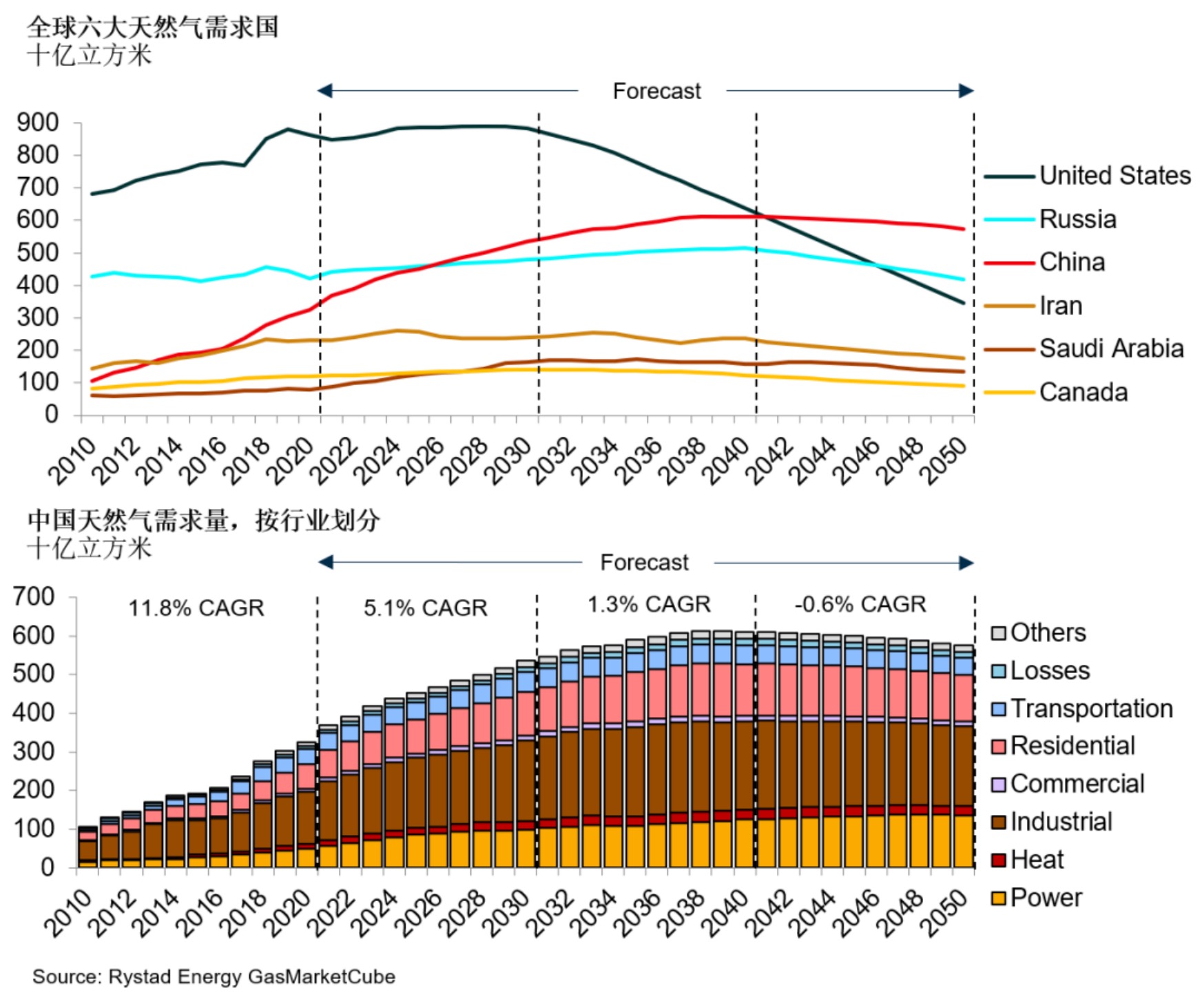 為了實(shí)現(xiàn)2060年碳中和目標(biāo),隨著可再生能源在中國(guó)能源結(jié)構(gòu)中的占比越來(lái)越大,睿咨得能源(Rystad Energy)預(yù)計(jì),2030-2040年中國(guó)天然氣需求年均復(fù)合增長(zhǎng)率將放緩至1.3%。隨著從2030年起美國(guó)的化石燃料需求將以更快的速度下降,預(yù)計(jì)中國(guó)將在2040年代初超過(guò)美國(guó),成為全球最大的天然氣消費(fèi)國(guó)。