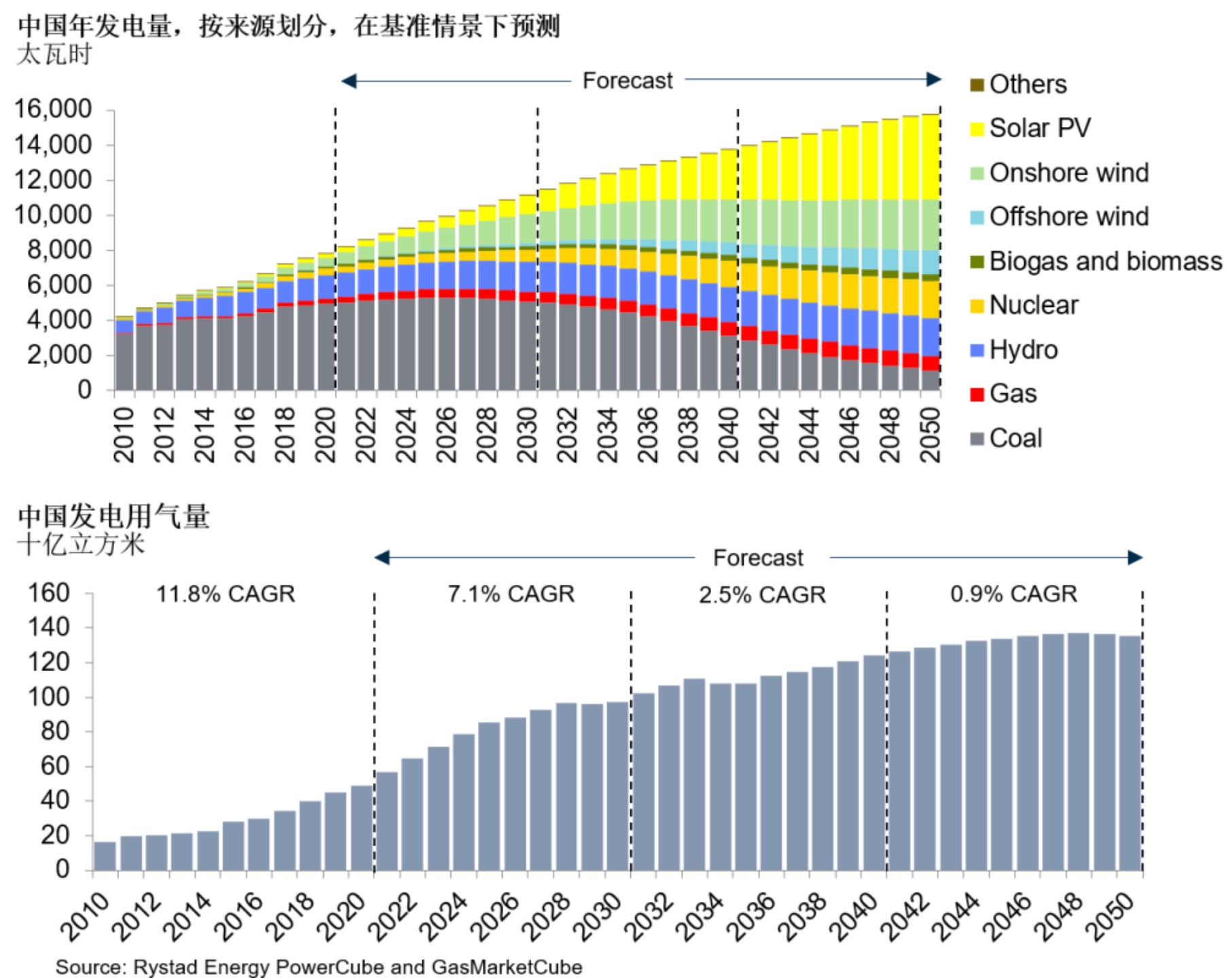 睿咨得能源(Rystad Energy)預(yù)計(jì),在2020-2030年期間,中國(guó)發(fā)電用氣需求將以7.1%的年均復(fù)合增長(zhǎng)率增長(zhǎng),期間將有更多的燃?xì)怆姀S(chǎng)投產(chǎn)用于調(diào)峰。2030-2040年發(fā)電用氣需求年均復(fù)合增長(zhǎng)率將放緩至2.5%,但屆時(shí)將是中國(guó)天然氣需求增長(zhǎng)的主要驅(qū)動(dòng)力,為了實(shí)現(xiàn)2060年碳中和目標(biāo),中國(guó)正在穩(wěn)步降低煤炭發(fā)電的比重,而天然氣將對(duì)確保電力穩(wěn)定供應(yīng)至關(guān)重要。