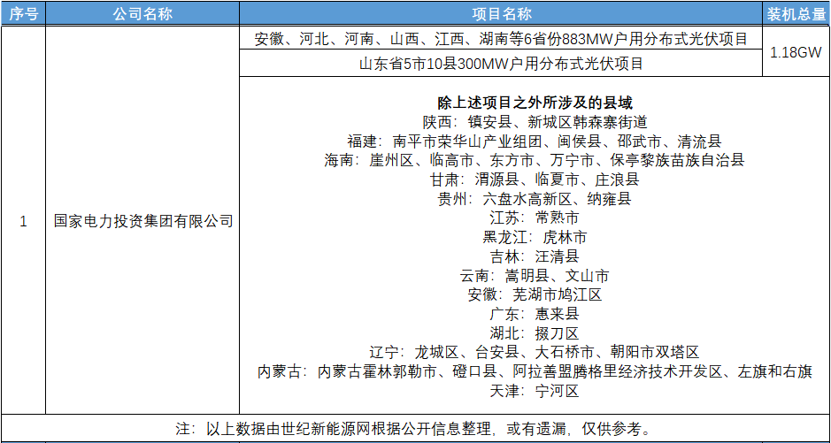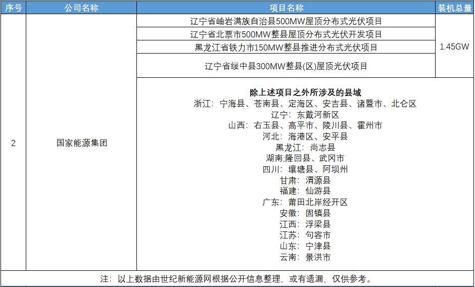 為實現(xiàn)至少開發(fā)500個縣(市、區(qū))域光伏試點的目標,國家能源集團已同浙江、遼寧、黑龍江、甘肅等省共33個市縣簽署了整縣分布式光伏試點協(xié)議,旗下國電電力、龍源電力已斬獲超2GW協(xié)議。