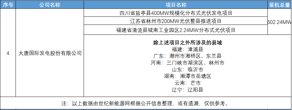 8月19日,大唐四川川匯水電投資有限公司與鹽亭縣政府簽訂規(guī)模化分布式光伏發(fā)電項目合作協(xié)議,計劃總投資約20億元,整縣裝機規(guī)模約400MW,運營期總收入約35億元,實現(xiàn)利稅收入約3.5億元;9月13日,大唐林州熱電有限責(zé)任公司與江蘇天合智慧分布式能源有限公司簽署戰(zhàn)略合作協(xié)議,雙方擬共同合作展開林州市200MW光伏整縣推進項目;10月21日,大唐國際寧德發(fā)電公司與清流縣人民政府舉行開發(fā)合作簽約儀式,其中一期擬合作開發(fā)城南工業(yè)園區(qū)分布式光伏項目,總投資約900萬元,計劃利用工業(yè)園區(qū)廠房35.98畝建設(shè)2.24MW分布式光伏發(fā)電項目,預(yù)計年平均發(fā)電量249萬千瓦時。