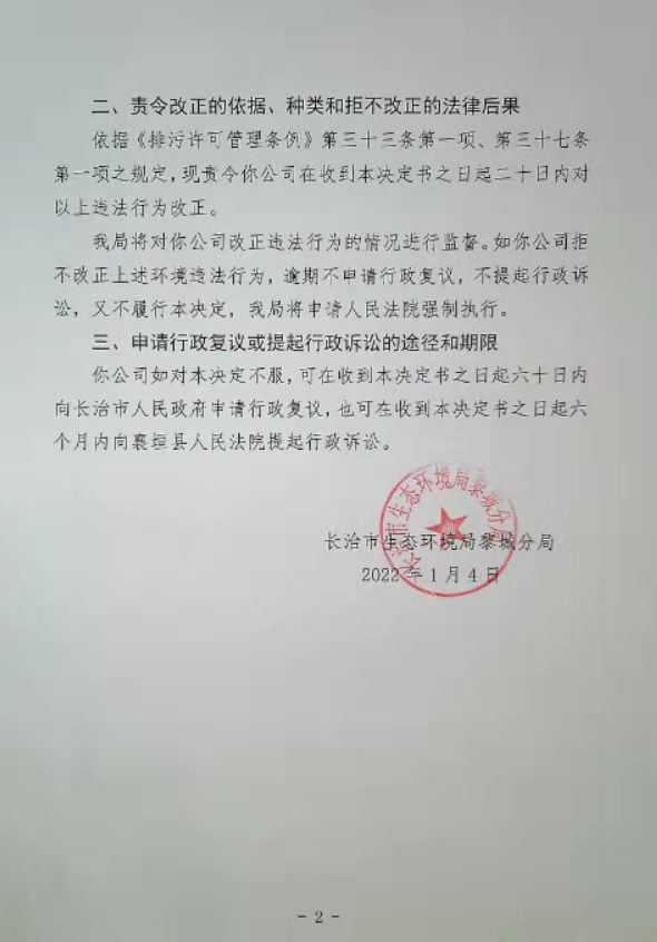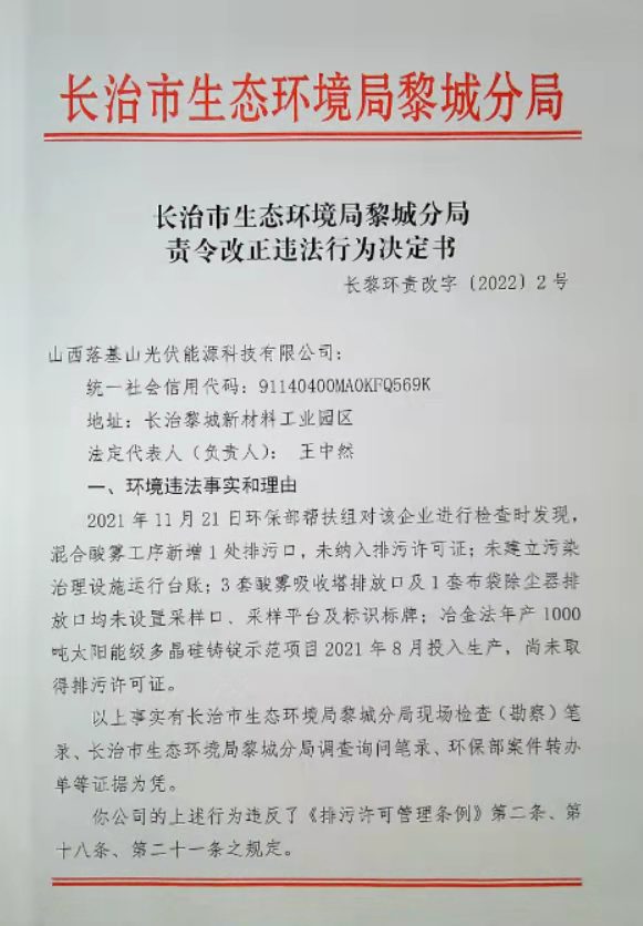 日前,長治市生態(tài)環(huán)境局黎城分局對山西落基山光伏能源科技有限公司違法行為作出責令改正決定,限1月24日前完成整改。