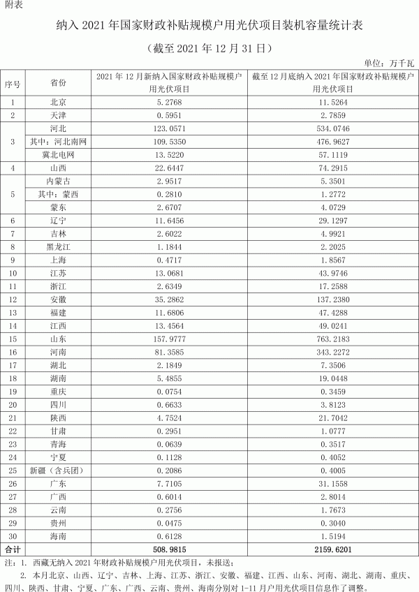 附表:納入2021年國家財(cái)政補(bǔ)貼規(guī)模戶用光伏項(xiàng)目裝機(jī)容量統(tǒng)計(jì)表(截至2021年12月31日)