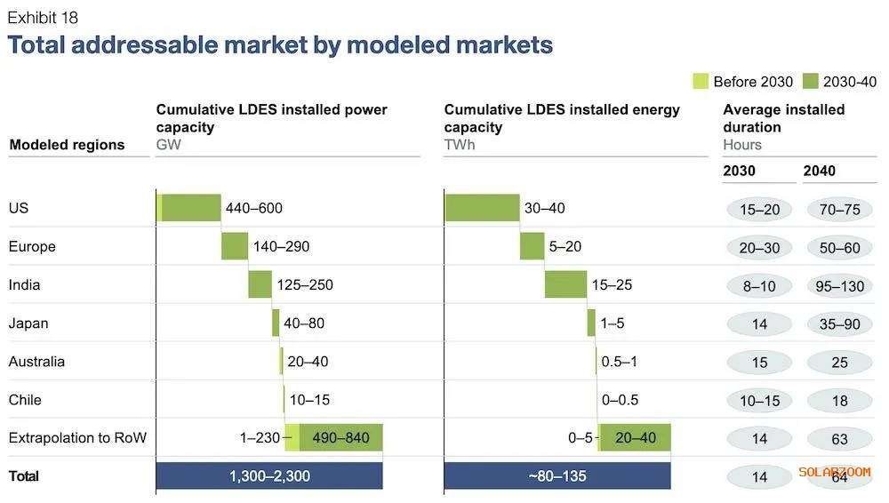 在澳大利亞,如下圖所示,該報告顯示,從2030年到2040 年,長時儲能的總潛在市場在20-40GW和0.5-1 TWh之間。