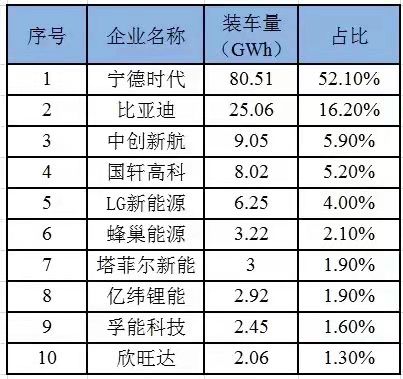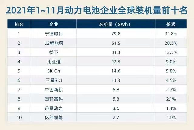 2021年全年,國內動力電池裝車量前十名分別是:寧德時代、比亞迪、中創新航、國軒高科、LG新能源、蜂巢能源、塔菲爾新能源、億緯鋰能、孚能科技、欣旺達,其中寧德時代以52.10%的占比高居榜首。