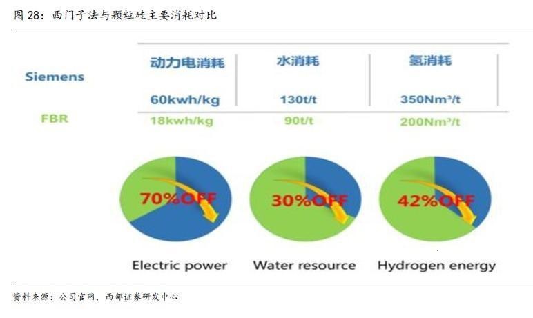 西部證券認為,“目前生產1千克顆粒硅耗電僅18度,相較于西門子法60度/千克有顯著下降;水耗氫耗方面,FBR方法較西門子法降低30%-42%;投資方面,顆粒硅每萬噸產能僅需要7億初始投資,相較西門子法可降低1.5-2億元,具備成本優(yōu)勢。”