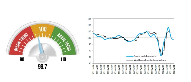 世貿組織貨物貿易晴雨表通過采集貨物貿易統計數據,就當前世界貨物貿易的發展趨勢和拐點提供早期信號,每季度更新一次,與服務貿易晴雨表相配合。數值超過100時表明全球貨物貿易增長高于預期水平,低于100則表明低于預期。